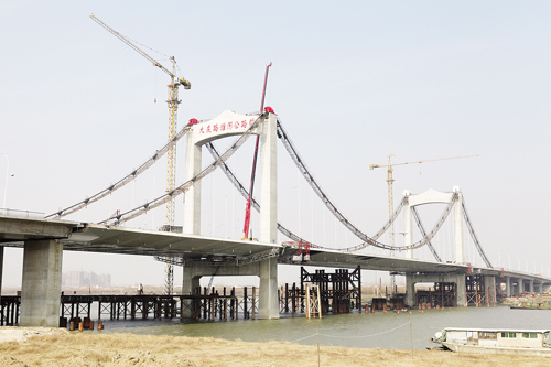 昨天上午,記者登上大慶路淮河公路橋主橋面時(shí),熱鬧的施工現(xiàn)場(chǎng)與寒冷的天氣形成了鮮明的對(duì)比。大橋最南端的接線上,幾臺(tái)機(jī)器正在攤鋪?zhàn)詈笠粚訛r青。大慶路淮河公路橋建設(shè)指揮部技術(shù)質(zhì)量部部長(zhǎng)薛峰告訴記者,橋面瀝青一天之內(nèi)就能鋪好。“瀝青是最后一道主要工序,完成后就標(biāo)志大橋主體大功告成了。”